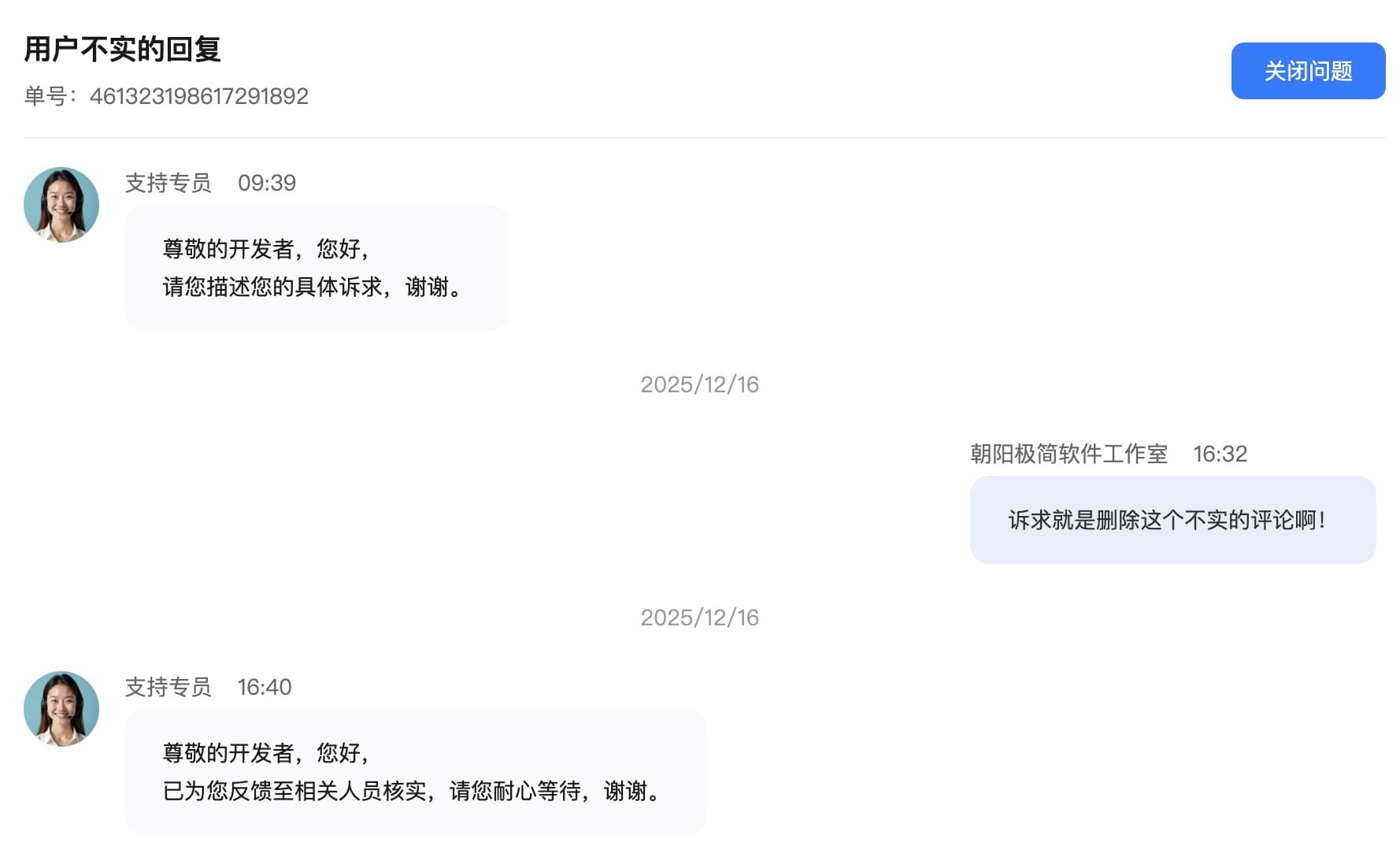 这显然是一个不实的评论,这个用户大概率是为了申请退款而留下这个评论想引起我的注意。根据评论时间查了一下退款记录,当天就给这个用户全额退款了,我是后来才看到这个评论的。于是我在后台申诉删除这个评论,结果客服回复的第一句是:请您描述您的具体诉求……这不智障吗。