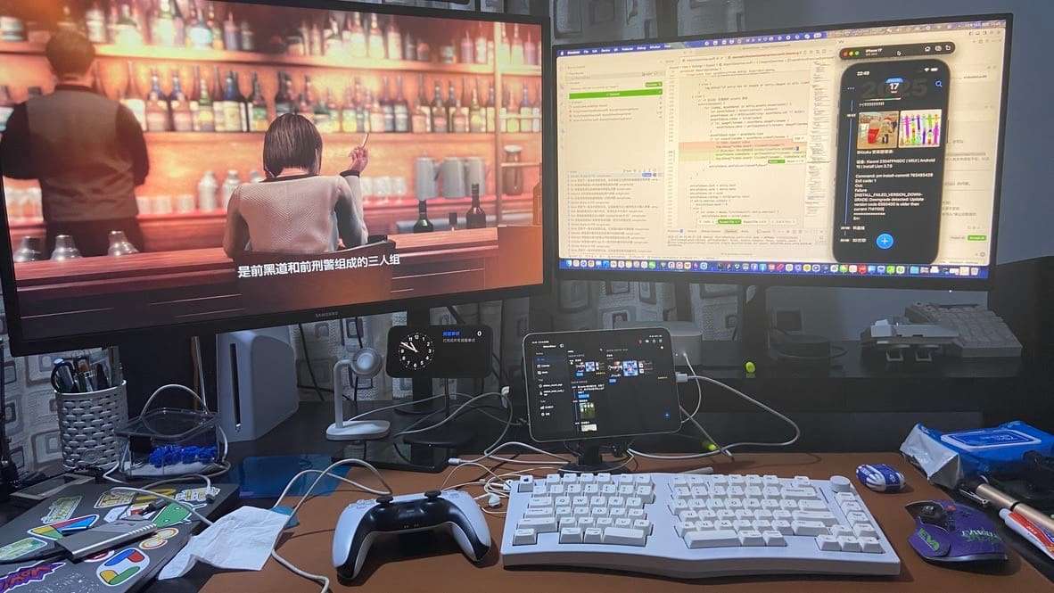 自打用 AI 编程后,每次等待 AI 生成代码的时间里都在刷手机。为了戒掉刷手机的坏毛病,把 PS5 搬到了电脑桌上,最近一周都是边玩游戏边写代码,双线并行,互不影响。